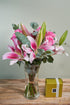 The flower vase contains 6 stems of pink roses & 3 stems of pink lilies and a box of Patchi 250 gms.